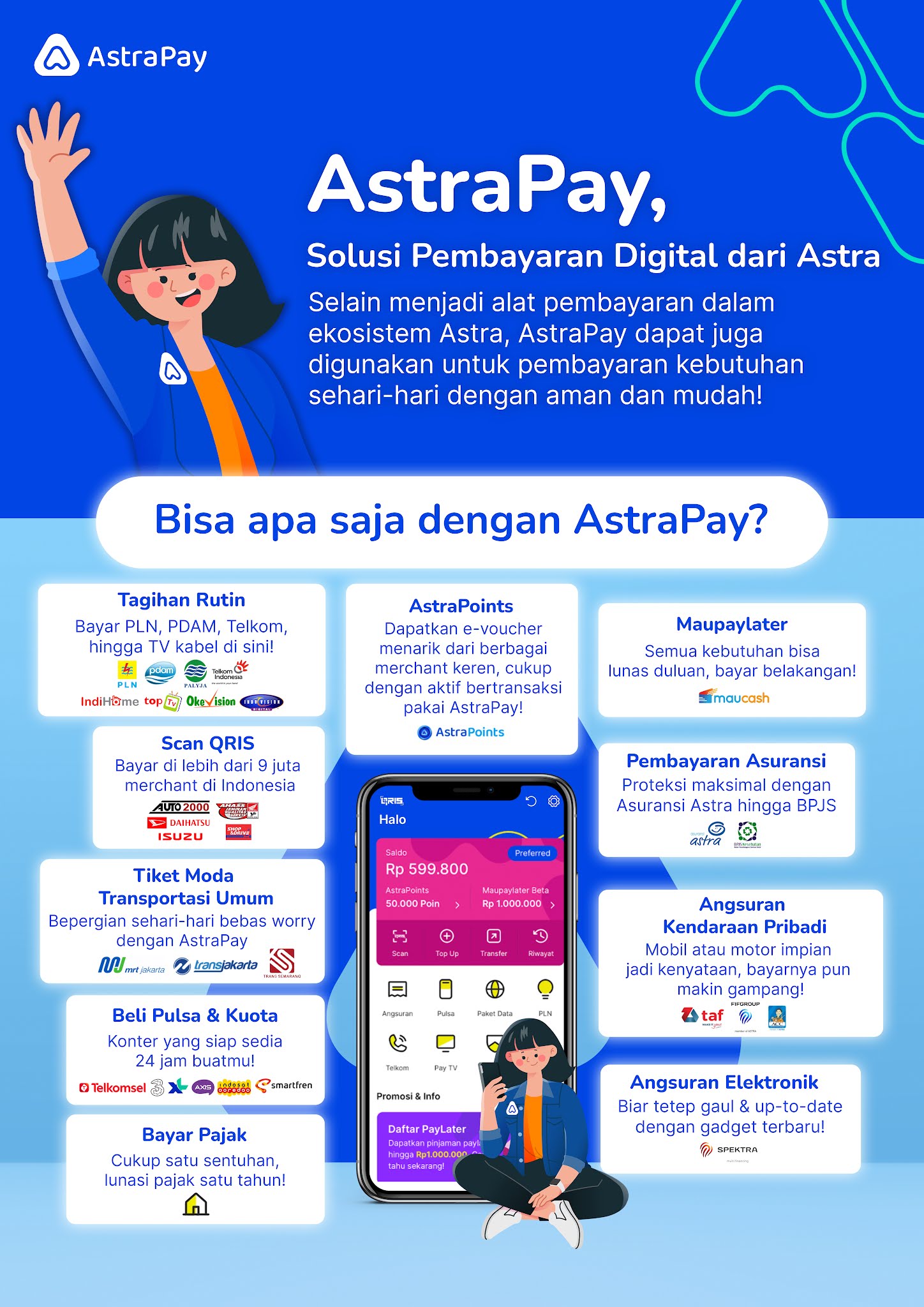 AstraPay juga telah terintegrasi dengan sistem pembayaran moda transportasi umum, seperti MRT Jakarta dan Transjakarta. Selebihnya, AstraPay juga dapat digunakan untuk membayar tagihan listrik, PDAM, TV kabel, BPJS, pajak, hingga beli pulsa atau paket data.