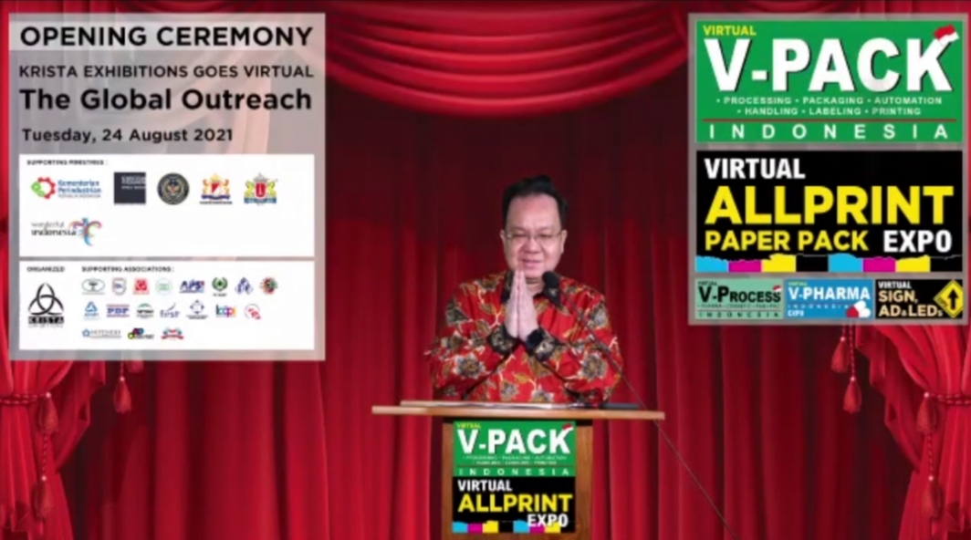Opening Ceremony yang diselenggarakan secara virtual pada tanggal 24/08/202, pukul 10.00 WIB. Pada kesempatan tersebut Peserta diajak untuk mengunjungi Pameran secara virtual (VIP Tour). Penyelenggaraan Pameran Virtual Pack Indonesia Expo, Virtual Process Indonesia Expo, Virtual Pharma Indonesia Expo, Virtual ALL Print Paper Pack Expo, Virtual Sign, Ad & LED’s Expo 2021 diharapkan dapat mengembangkan teknologi dan menciptakan ide-ide terbaru di tengah pembatasan jarak sosial untuk mendorong pelaku usaha di industri kemasan dan percetakan, menciptakan kreativitas dalam menghasilkan produk-produk yang berkualitas dan memberikan informasi mengenai perkembangan teknologi terbaru dalam bidang kemasan dan percetakan, serta sebagai titik pertemuan bagi para industri percetakan untuk mempelajari lebih lanjut tentang kebutuhan industri percetakan dan kemasan di masa pandemi ini.