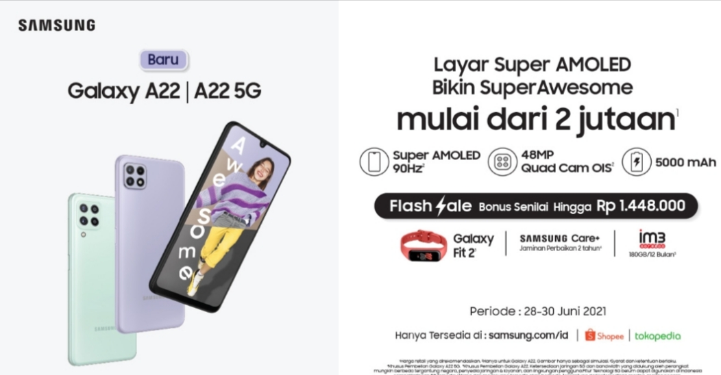 Bagi generasi social savvy yang selalu berlomba mengikuti tren, pastinya selalu menyenangkan punya smartphone dengan layar dan kamera yang mumpuni untuk bikin konten, mabar, menyelesaikan tugas sekolah atau kuliah, maupun streaming kapan pun, dan di mana pun. Dengan layar Super AMOLED 90Hz refresh rate dan Quad Camera 48MP+OIS, Samsung Galaxy A22 LTE adalah pilihan dengan fitur premium di bawah 3 juta untuk jadi teman setia pendukung beragam aktivitas generasi muda. Kejar bonus langsung Awesome berupa Samsung Galaxy Fit2 senilai Rp699.000, serta kuota data dari Indosat Ooredoo 180GB setahun selama Flash Saletanggal (28-30/06/2021), cuma di Samsung.com dan Shopee,” ujar Irfan Rinaldi, Product Marketing Manager Samsung Mobile, Samsung Electronics Indonesia.