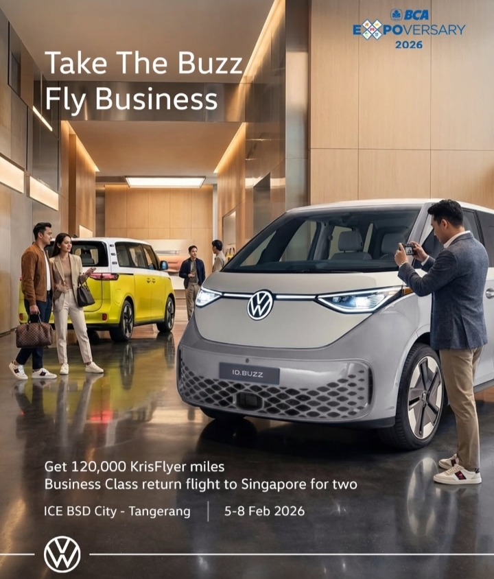 Tak hanya menghadirkan produk unggulan, Volkswagen Indonesia juga menawarkan promo eksklusif hasil kolaborasi dengan Singapore Airlines melalui program KrisFlyer. Selama BCA Expoversary 2026, setiap pembelian Volkswagen ID. Buzz berhak mendapatkan 120.000 KrisFlyer Miles, setara dengan perjalanan Business Class Singapore Airlines ke Singapura untuk dua orang.
